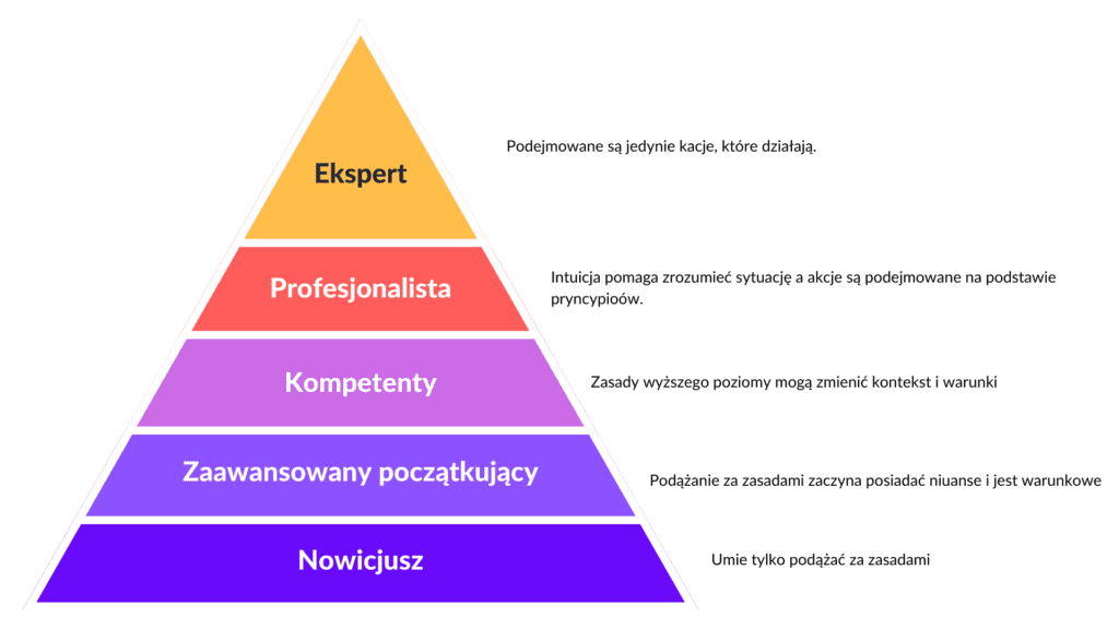 Poniżej przedstawiono pięć etapów podróży od nowicjusza do eksperta oraz ogólnikową definicję, za czym podążają, rozwijając swoje umiejętności.